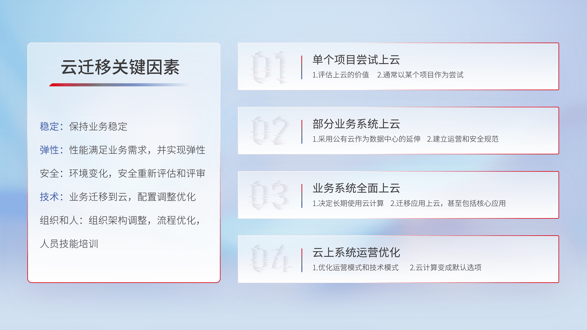 结合实际业务,,,从规划设计、、云平台选型、、、云原生改造、、、、数据迁移、、、、集成交付,,,迁移全过程为客户识别最佳上云路径,,,做好风险识别管理,,,设计网络架构、、、、身份权限、、、安全审计合规、、、操作审计、、日志审计、、、、监控告警策略、、多站点容灾设计等,,,,对云上基础设施进行整体规划,,,提升IT治理水平,,,以满足弹性、、、高可用、、、、高性能的需求。。。。