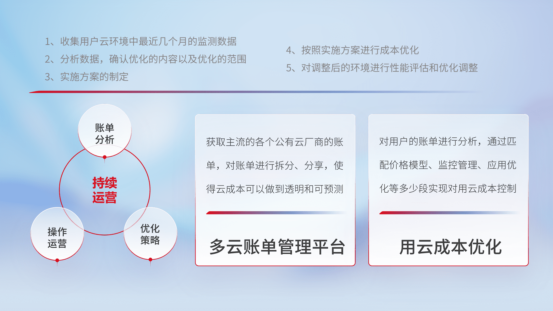 通过多云纳管,,以统一的资源数据模型把客户的云资源进行抽象和封装,,,,进而实现对多云资源的统一操作,,保障云资源管理的可靠性、、、、稳定性与可用性。。量身定制化运维内容,,,,配置、、、、开发运维、、、、补丁管理、、备份、、、、监控、、认证和访问管理、、、审计和日常巡检等,,,,保障在用云过程中的可靠度,,,,稳定度以及高可用率。。